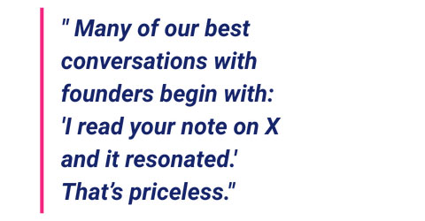 Nish: How has this ‘public thinking’ benefited DSGCP beyond LPs and founders – for example, in hiring, partnerships, or sourcing or syndicating deals? Do you have any kind of formal mechanism for evaluating ROI on content, or is it evaluated qualitatively while having inherent faith in the value of content?